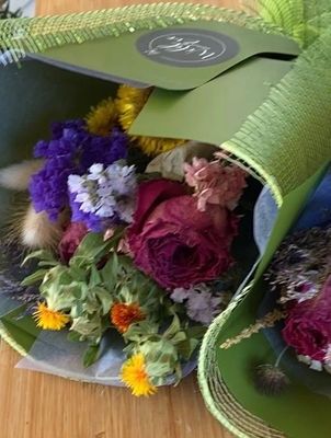 *If you order a Dried Flower Bouquet for local delivery, it will be an open design. If it is for courier delivery outside of the local area, your design will be lovely dried stems of flowers and foliage, arranged in a close upright design. This is to allow the bouquet to fit safely within the courier box. As it is, this will be a beautiful design to pop straight into your favourite vase. If you prefer a more open design, once your flowers have arrived and while still holding the shape of the bouquet with your hands, it can be untied, and gently released and encouraged into a wider more open design, re-tied and then displayed in your vase.